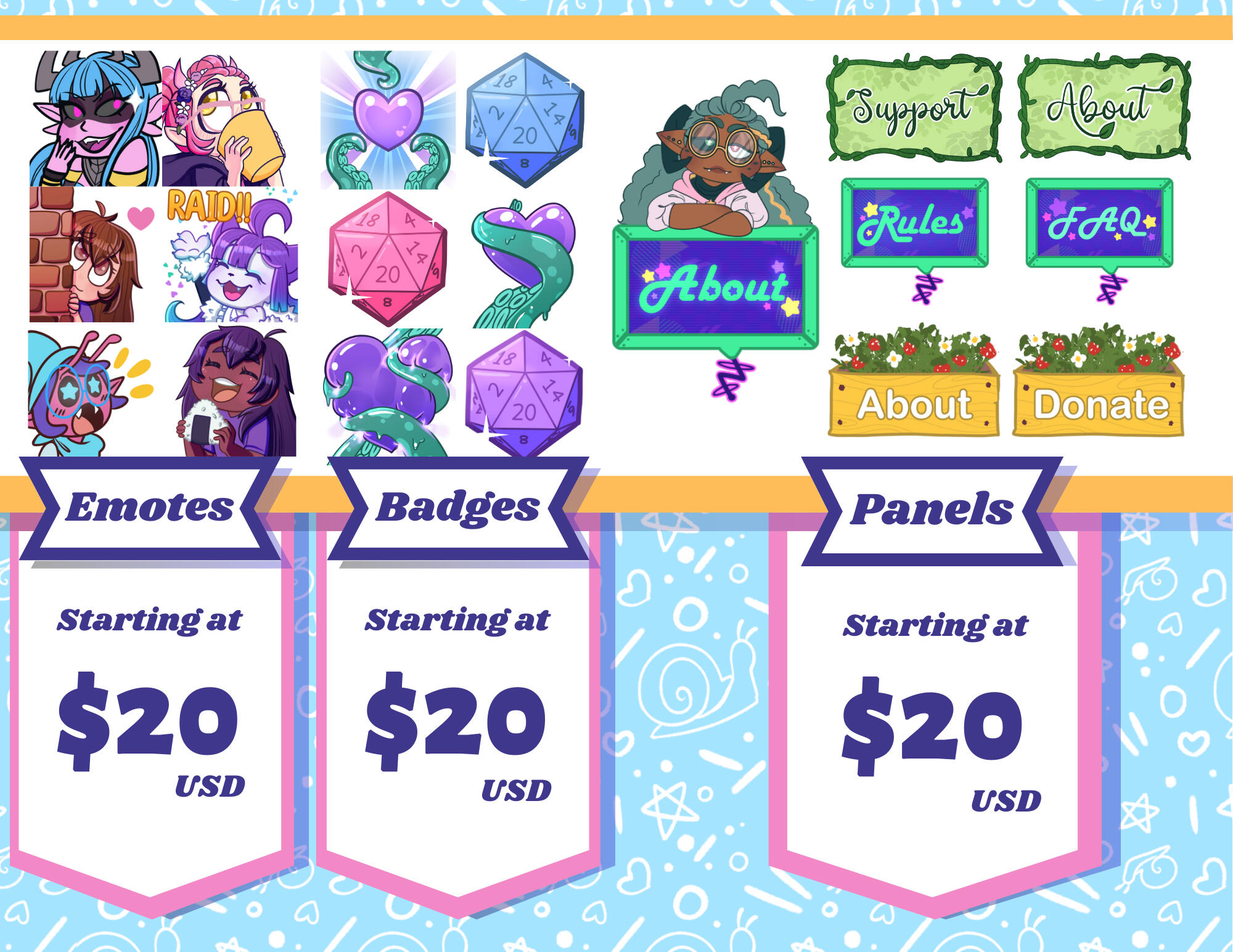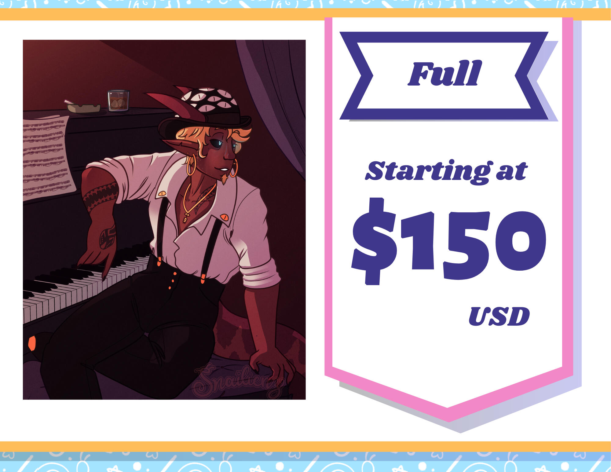 All commissioned artwork by me is the property of the owner for personal use only. Any commissioners utilizing commissioned artwork for commercial purposes will be blacklisted and in some cases see legal action. Please email me privately to receive commercial rights.What are commercial rights? Any use of my art that permits the user direct monetary reward for the use of my artwork is considered commercial use. The only exception is the situation of a twitch subscription to receive emotes or badges. This is already factored into their price.My art will NEVER be used for AI generation, crypt0art or N/F/T content. Do not commission me if that is your intention. This already breaks ToS, but just in case. I will also cancel your commission if I find out your payment was done with crypt0currency without my knowledge. If I've already worked on the piece in question, you forfeit your refund due to breaking ToS.NSFW/Lewd art is currently closed. I feel I need more practice in this before I start offering services.I will not use someone else's YCH, adoptable, or other art meant to be sold to create a commission for you. Go pay that artist.I will not under any circumstances work with LGBTphobic, racist or otherwise unsavory individuals.No refunds will be issued once work has started. Refunds can only be processed up to 48 hours after the initial invoice is paid. After that point, I will go on a case by case basis.Payment must be made up front in full, unless the price is over $200. In which case, the payment can be half and half upon request.
